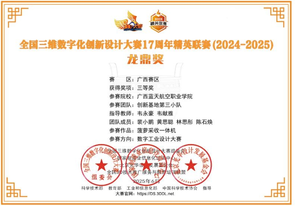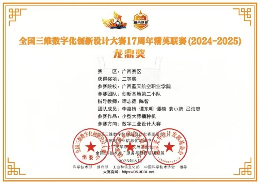 摘要: 近日,全国三维数字化创新设计大赛 17 周年精英联赛(2024 - 2025)广西赛区获奖名单公布,我校航空工程学院组织的 4 组参赛队伍共获得了广西赛区二等奖 2 项、三等奖 1 项 的优异成绩,他们以专业素养与创新活力在三维数字化创新领域再展蓝航风采。