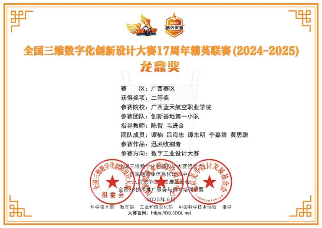 摘要: 近日,全国三维数字化创新设计大赛 17 周年精英联赛(2024 - 2025)广西赛区获奖名单公布,我校航空工程学院组织的 4 组参赛队伍以卓越表现斩获广西赛区二等奖 2 项、三等奖 1 项 的优异成绩,以专业素养与创新活力在三维数字化创新领域再展蓝航风采