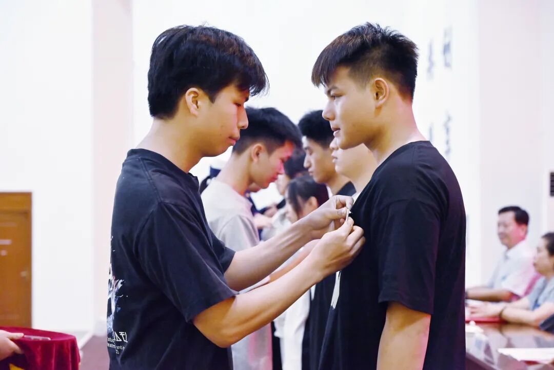 在热烈的氛围中,举行了新生佩戴?;找鞘?。在校生代表为新生代表佩戴校徽。小小的校徽,是蓝航精神的传承,更是新生身份的象征,标志着他们正式融入校园大家庭。